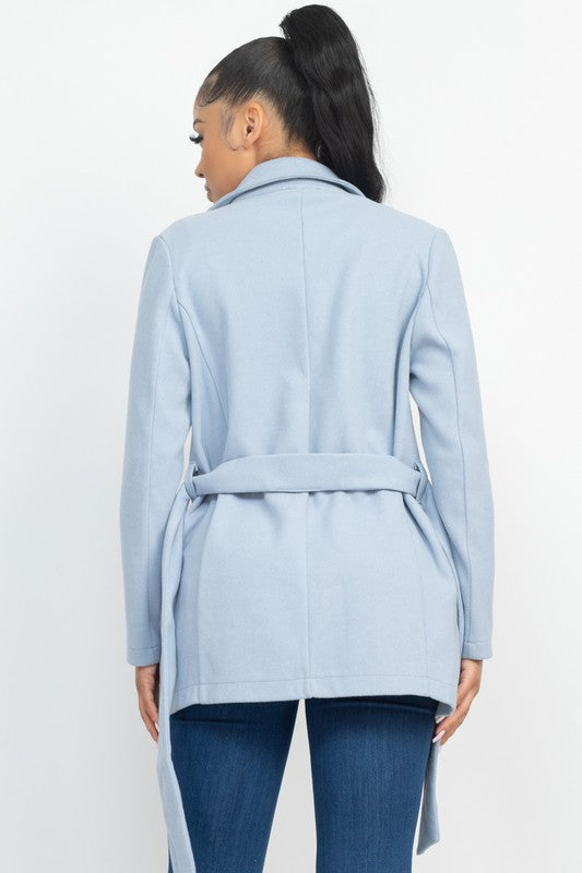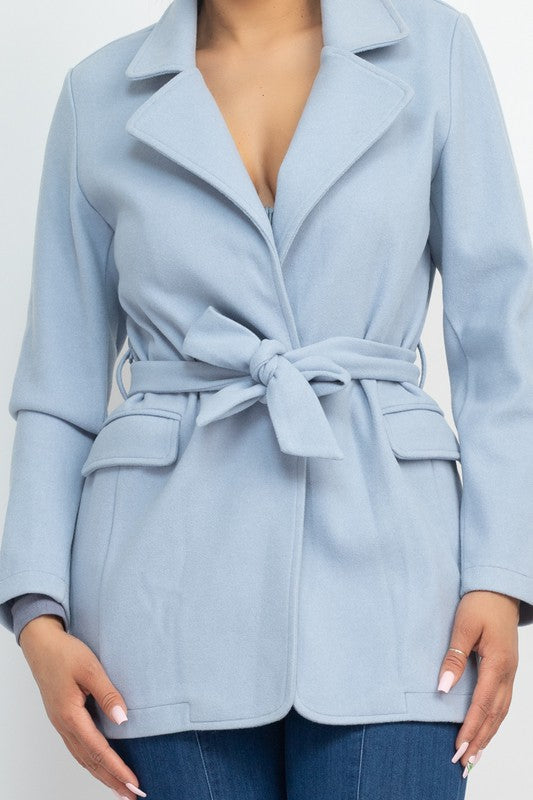 ABRIGO DE MODA SOSTENIBLE DE PUNTO CON CINTURON HASTA LA CADERA, CON BOLSILLOSCON SOLAPA DE COLOR LISO CON MUESCAS, MANGAS LARGAS, UN SOLO BOTON Y UN CINTURON CON UN LAZO.