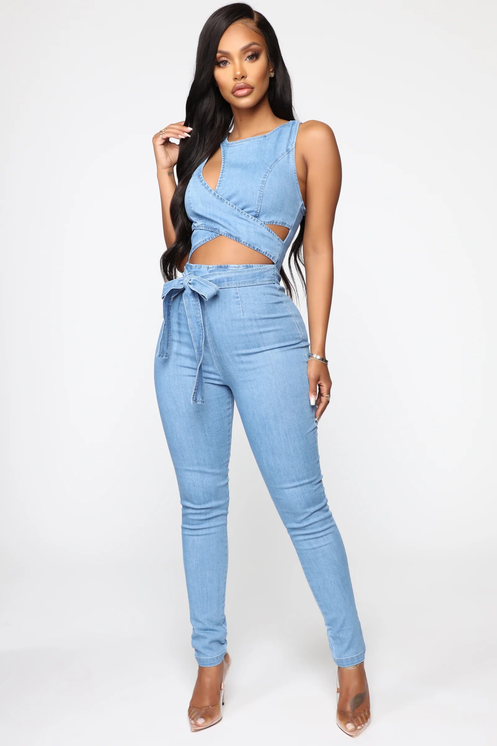 CUT OUT THE HATERS DENIM JUMPSUIT FASHION NOVA