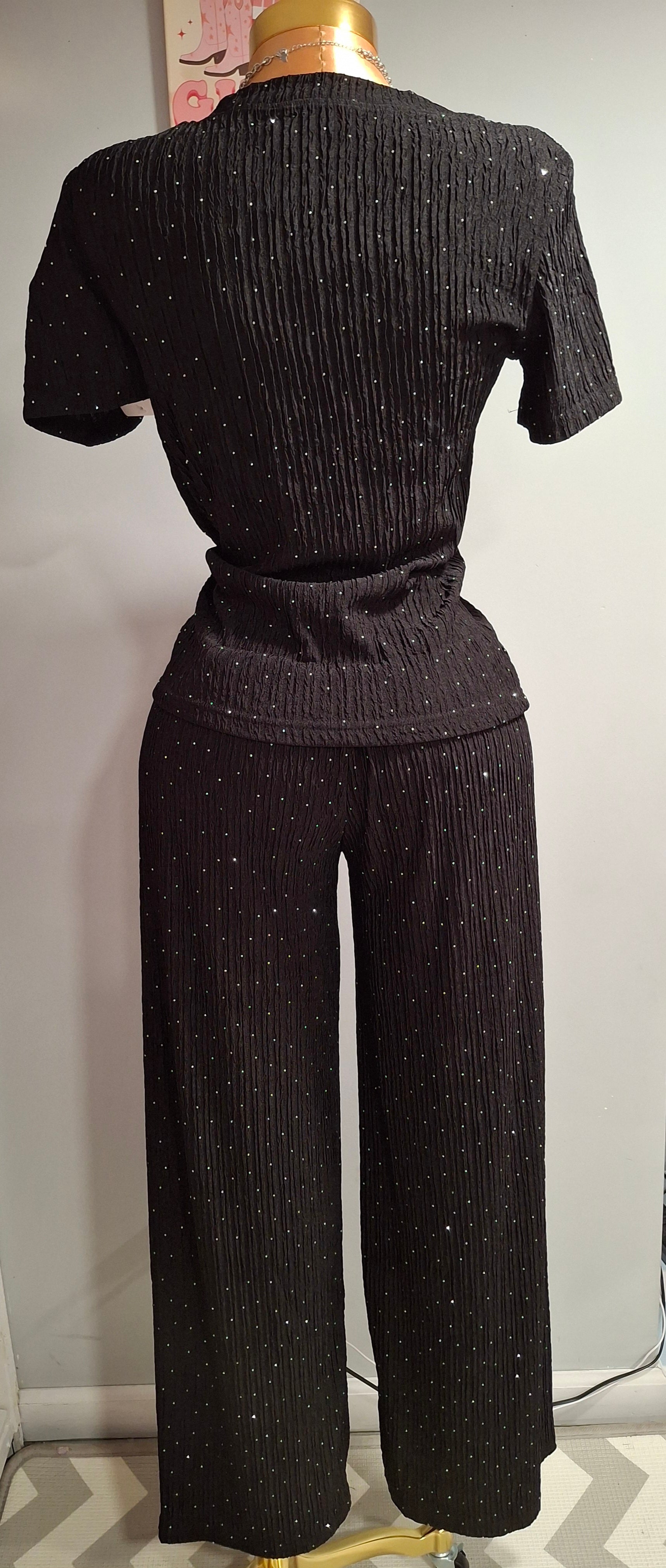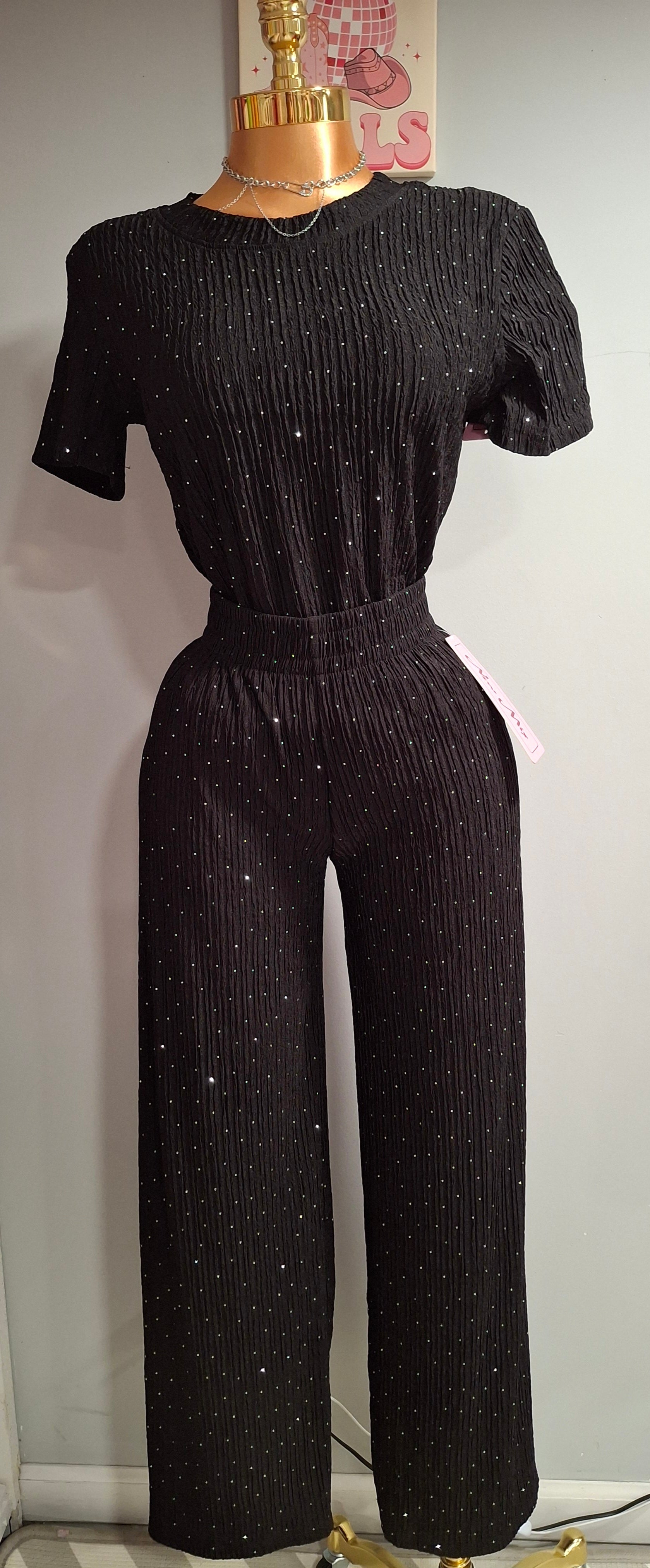 ¡Este set es un escándalo de brillo! Si te gusta robar miradas y vestir con elegancia y actitud, este es para ti. El conjunto incluye blusa y pantalón completamente decorados con piedras, colocadas estratégicamente para resaltar tu figura y darte un look lujoso, moderno y poderoso.