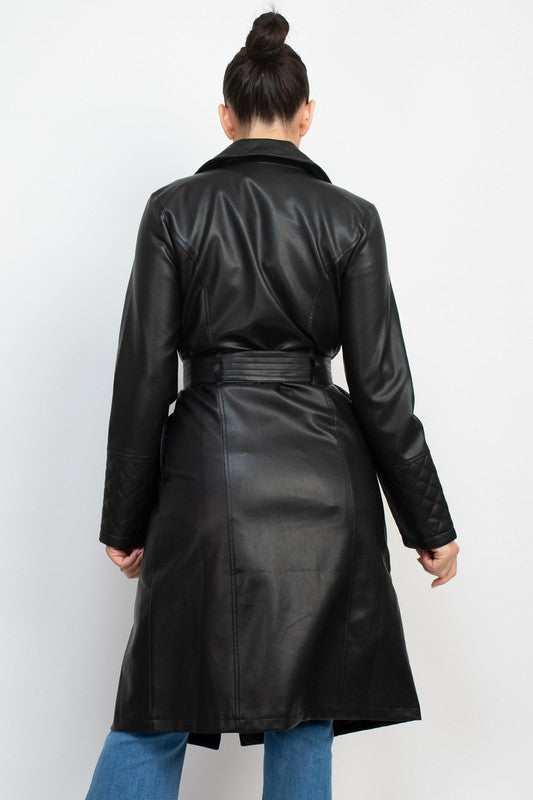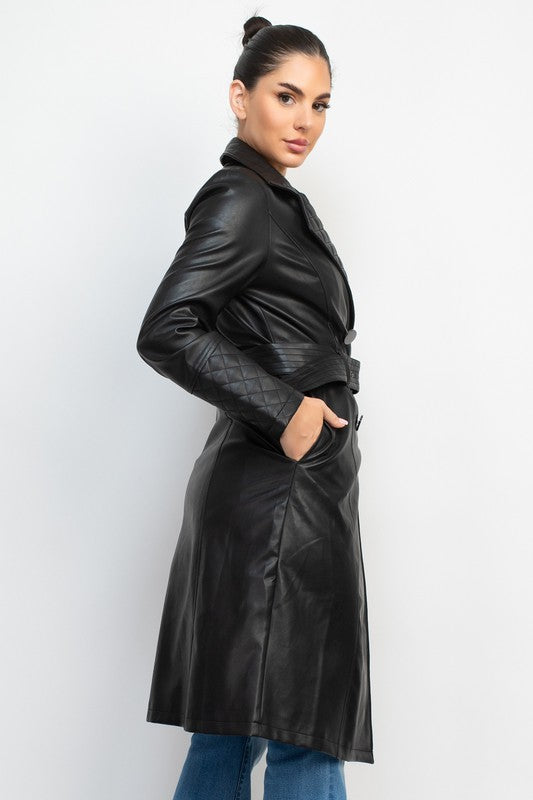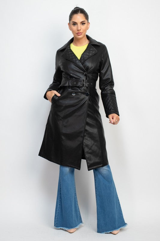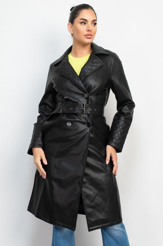 ABRIGO ACOLCHADO DE PIEL SINTETICA EN COLOR LISO Y UNA PRENDA ELEGANTE CON SOLAPA DE MUESCA, DOBLE BOTONADURA, COSTURAS, MANGAS LARGAS, CINTURON Y LARGO MIDI.