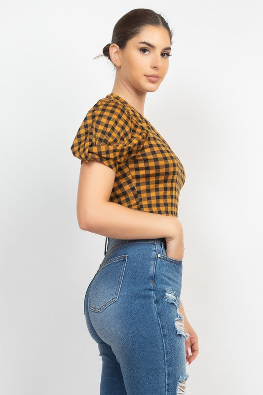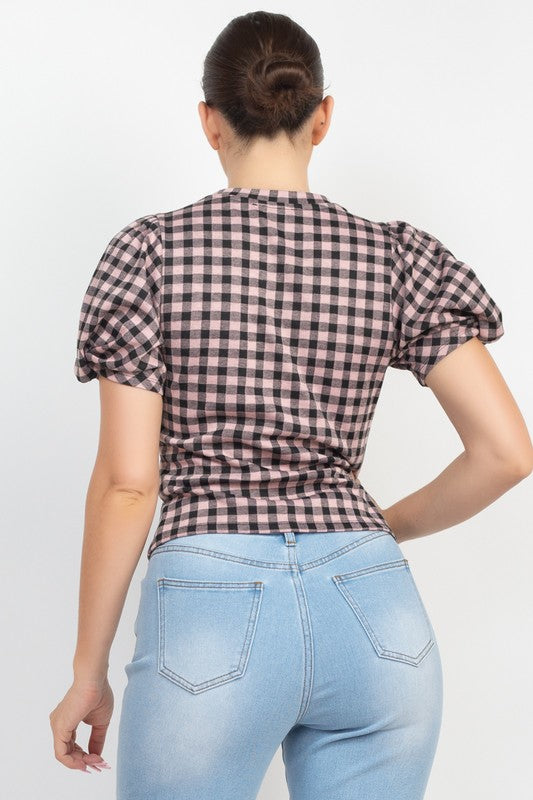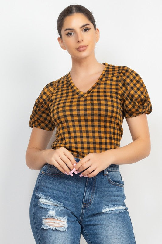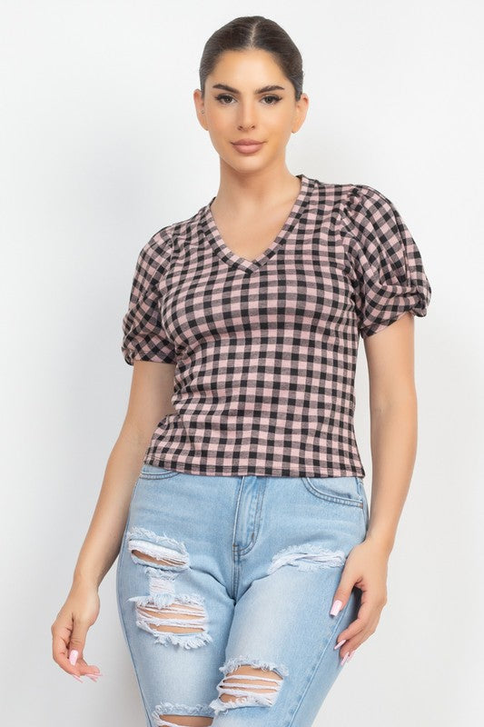 A knit casual top in an all-over checkered design featuring a V-neckline, short twisted ruched sleeves, and a waist-length. Made in Cambodia.
