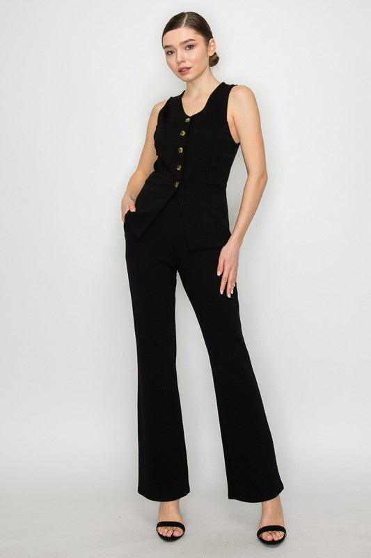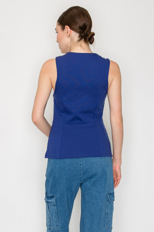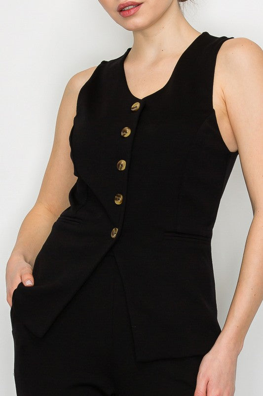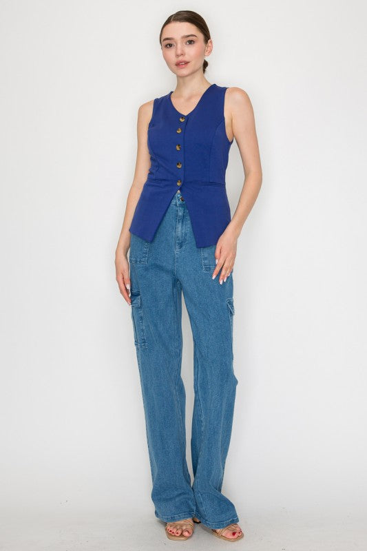 sleeveless, front button closure, and a side welt pockets. Made in Cambodia