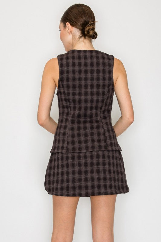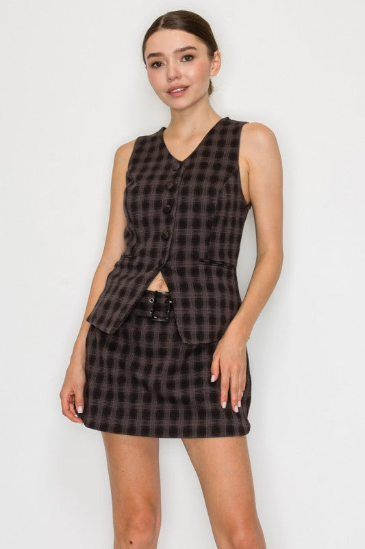 A polished wardrobe vest top with plaid pattern featuring V-neckline, welt pockets, sleeveless, tailored, elastic, slight flare hem, button-down closure, and a waist length. Made in Cambodia
