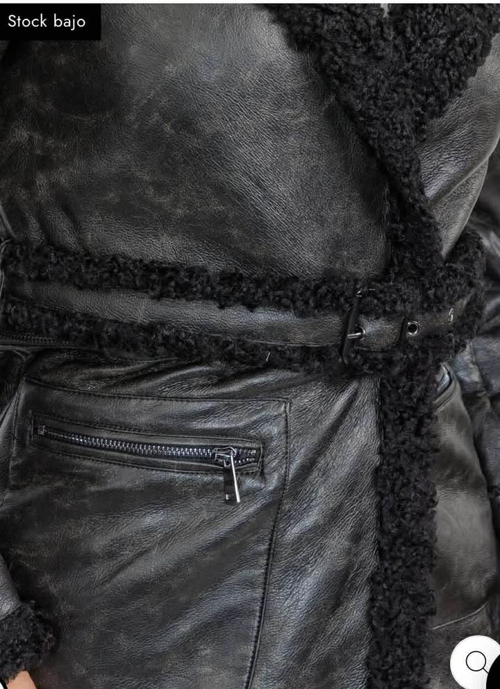 Contraste de Texturas Edgy: Confeccionado en cuero sintético (polipiel) con un acabado ligeramente texturizado o envejecido, y un forro interior visible de borreguito (sherpa) negro que se extiende por los bordes.
