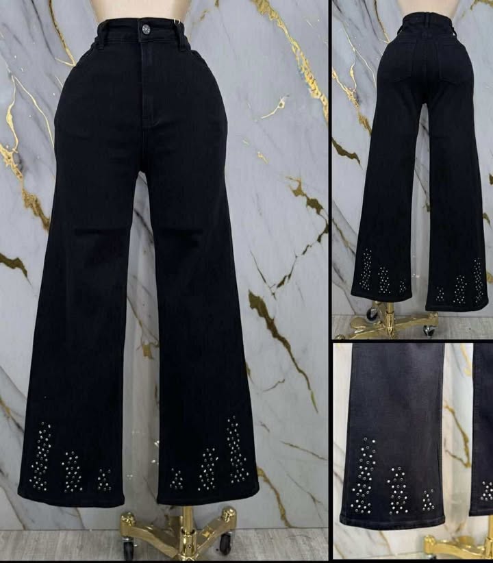 Estos jeans negros de pierna ancha son una prenda versátil y moderna que le dará un toque de estilo a cualquier atuendo. Su diseño de tiro alto y pierna ancha crea una silueta elegante y favorecedora. Lo que realmente los hace únicos son los detalles de tachuelas plateadas en el dobladillo, que añaden un toque de brillo y originalidad a un clásico.