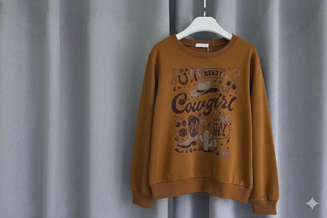 Este suéter captura la esencia de la chica del oeste con un diseño encantador y lleno de detalles que brillan sutilmente. El gráfico central "Howdy Cowgirl" está rodeado de iconos clásicos del rancho como un sombrero, botas vaqueras, una herradura, cactus y estrellas, todo con un toque vintage y femenino realzado por pequeños destellos que capturan la luz.