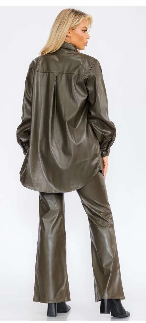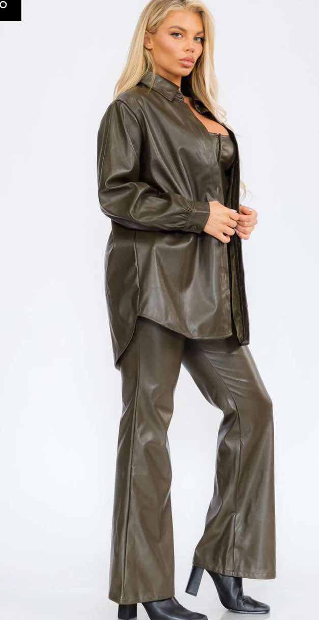 Domina la tendencia del cuero con este conjunto de dos piezas o camisa larga de polipiel que irradia sofisticación y actitud. El material y el color combinan perfectamente para crear un look arriesgado y elegante.