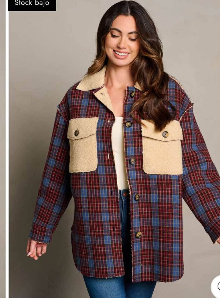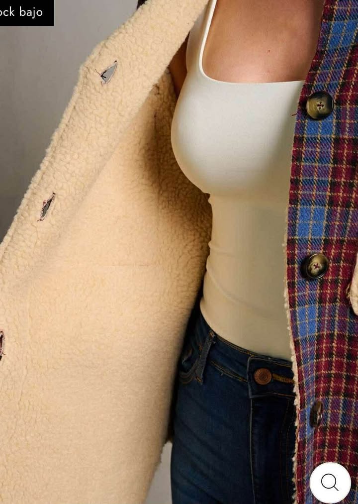 Contraste de Texturas Único: Lo que hace a esta prenda especial es el juego de tejidos. Combina una base de franela o lana suave a cuadros con detalles de borreguito (sherpa) esponjoso en color beige o crema.