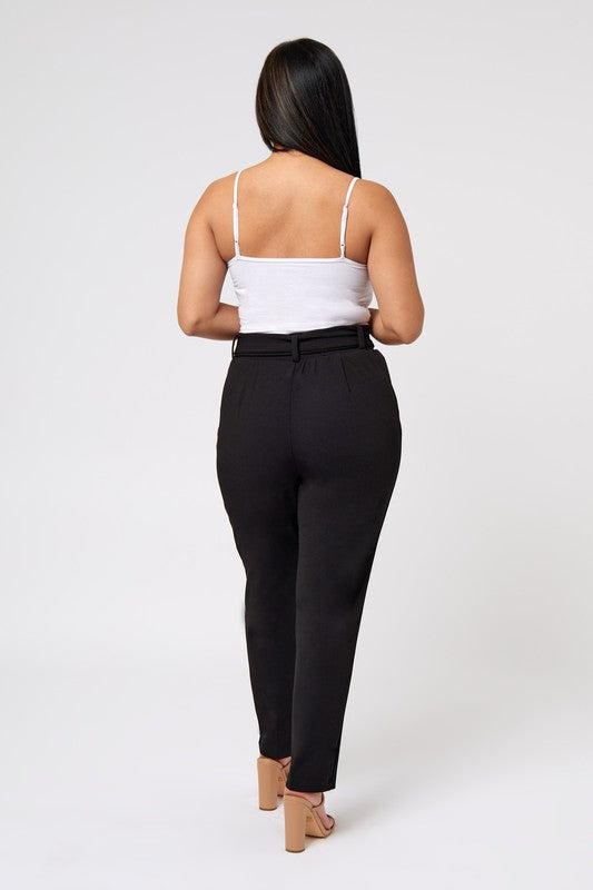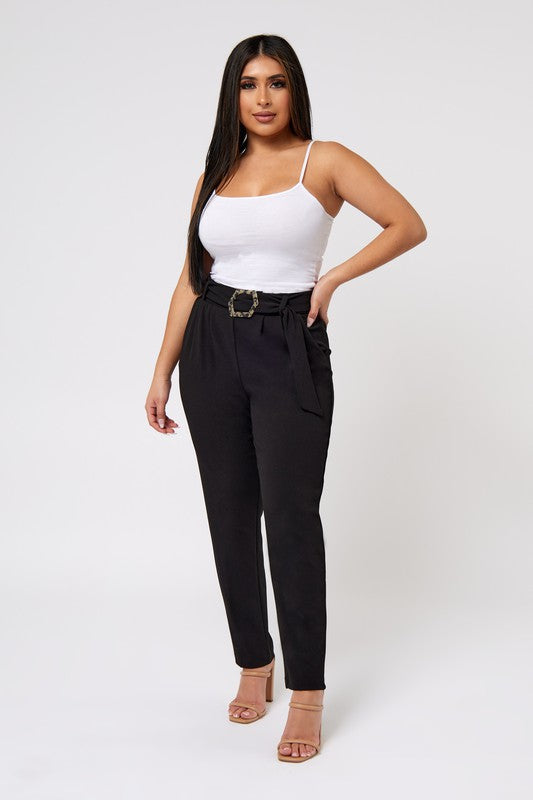 Self fabric belt with a lucite belt buckle, hi rise, tapered leg, slim trouser, easy pull on waistband in our comfortable and easy care knit crepe fabric