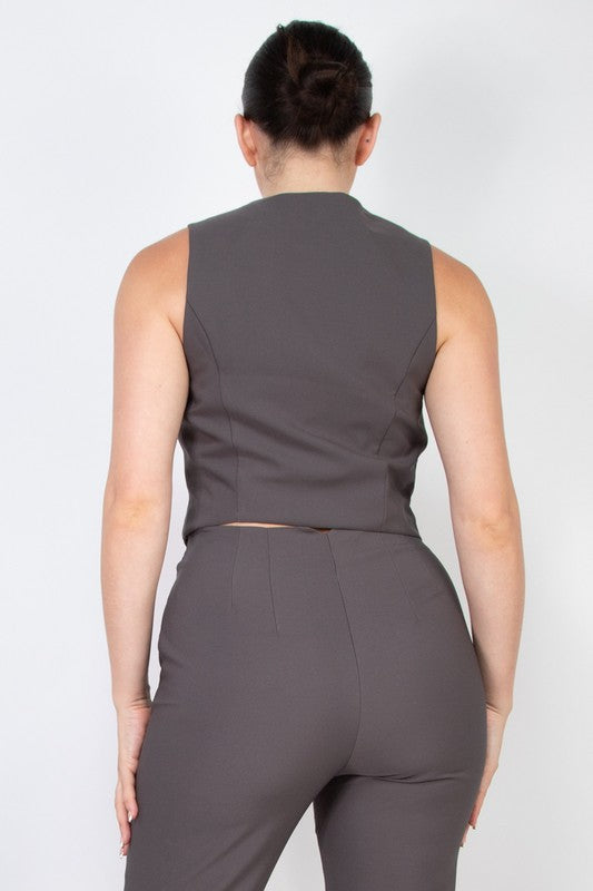 Este set de dos piezas es ideal para mujeres modernas, seguras y sofisticadas. Incluye un chaleco tipo sastre sin mangas con botones al frente y un corte entallado que realza la figura, acompañado de un pantalón de tiro alto con pinzas que estilizan la cintura y piernas.