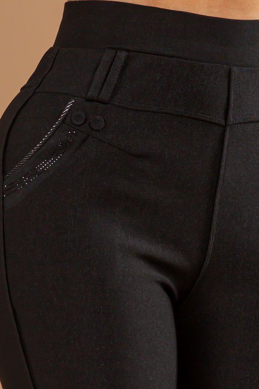 Estos son unos pantalones de vestir en color negro, diseñados para ofrecer un look sofisticado y profesional, sin sacrificar la comodidad. Su diseño entallado y de talle alto es perfecto para estilizar la figura.