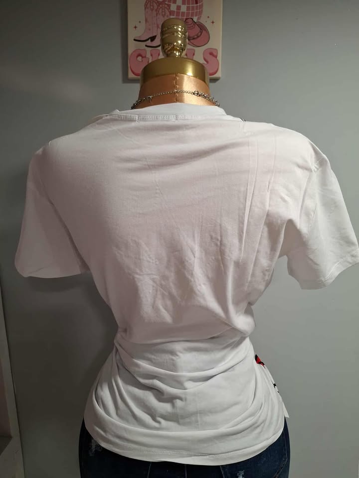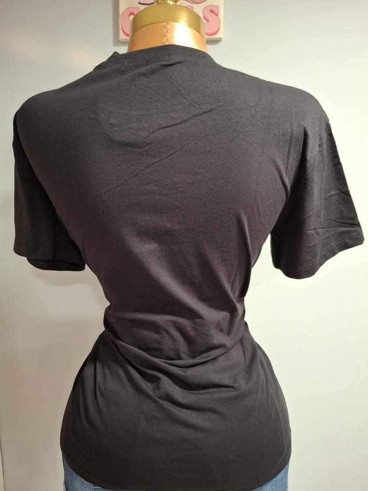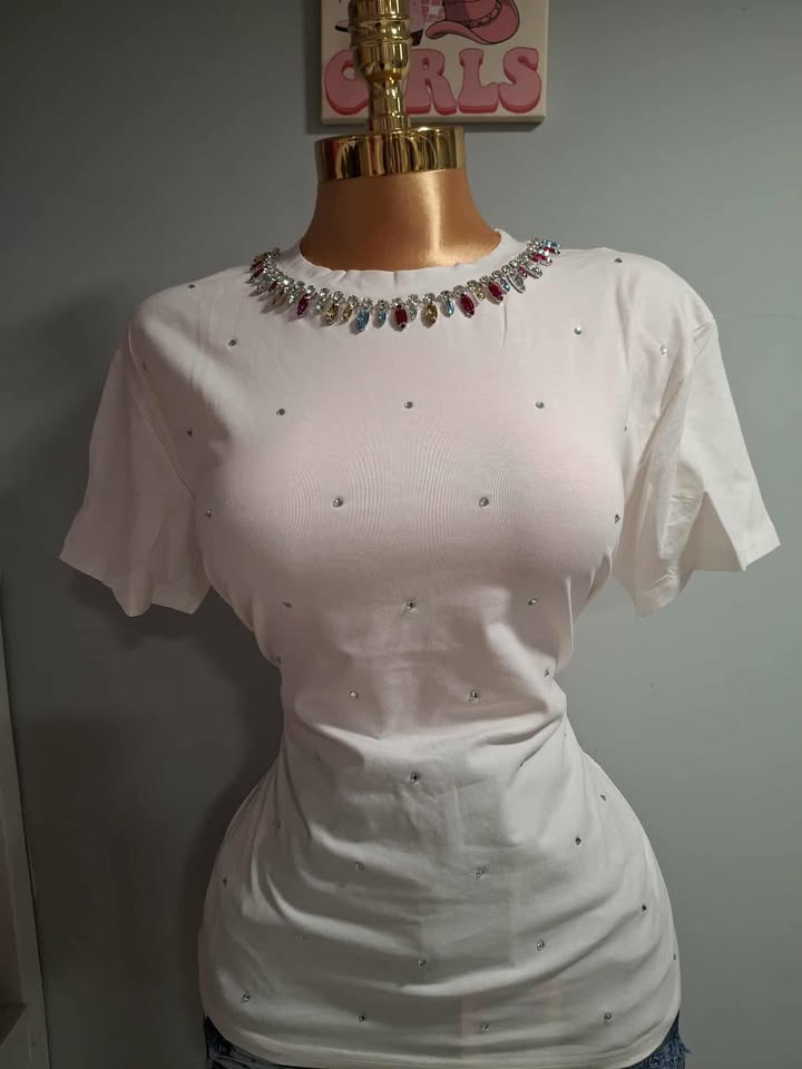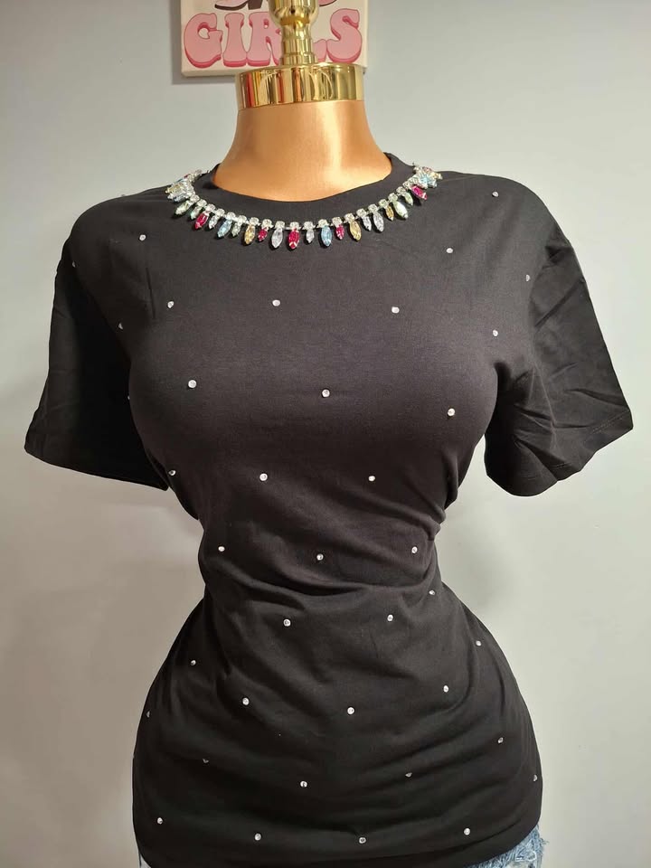 Blusa de manga corta, confeccionada en tela fresca y cómoda. Cuenta con un elegante diseño en color negro (también disponible en blanco), decorada con pequeños brillos distribuidos al frente que le dan un toque sofisticado. El detalle principal está en el cuello redondo adornado con pedrería de colores, tipo collar, que resalta y aporta un look moderno y chic.