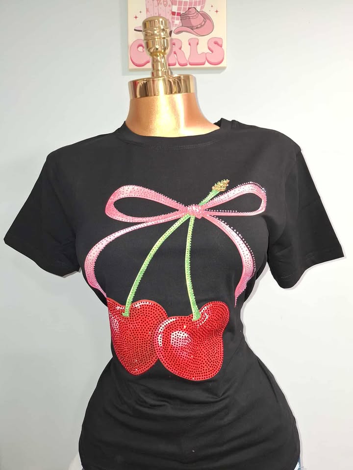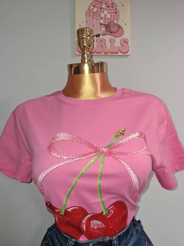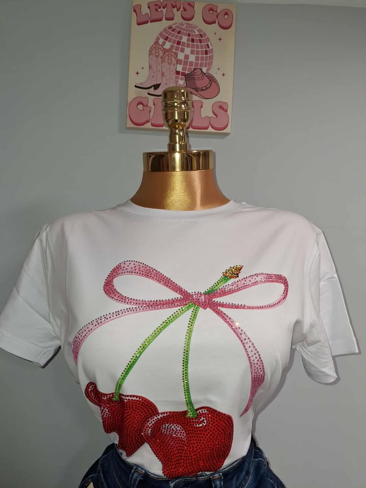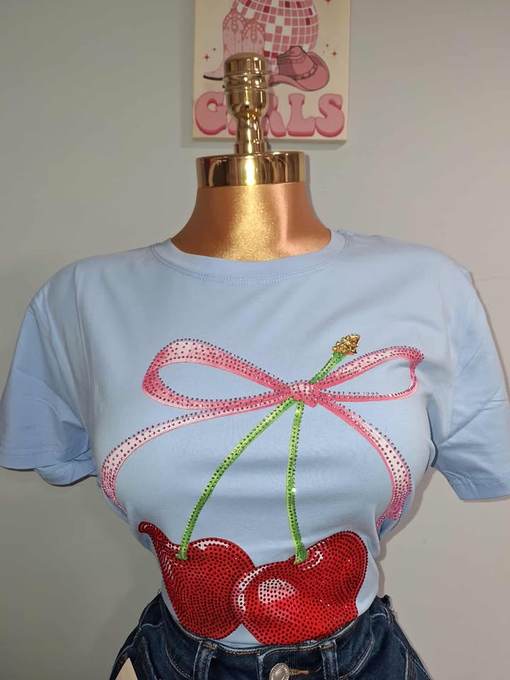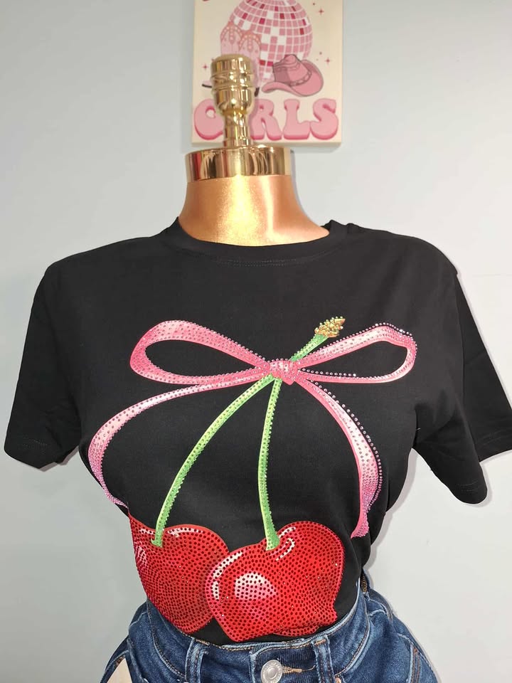 Blusa casual y femenina con estampado de cereza decorada con brillos que le dan un toque divertido y llamativo. Su tela es suave y ligera, ideal para el día a día o para un look juvenil con estilo. Perfecta para combinar con jeans, shorts o faldas y destacar con un detalle único en tu outfit.